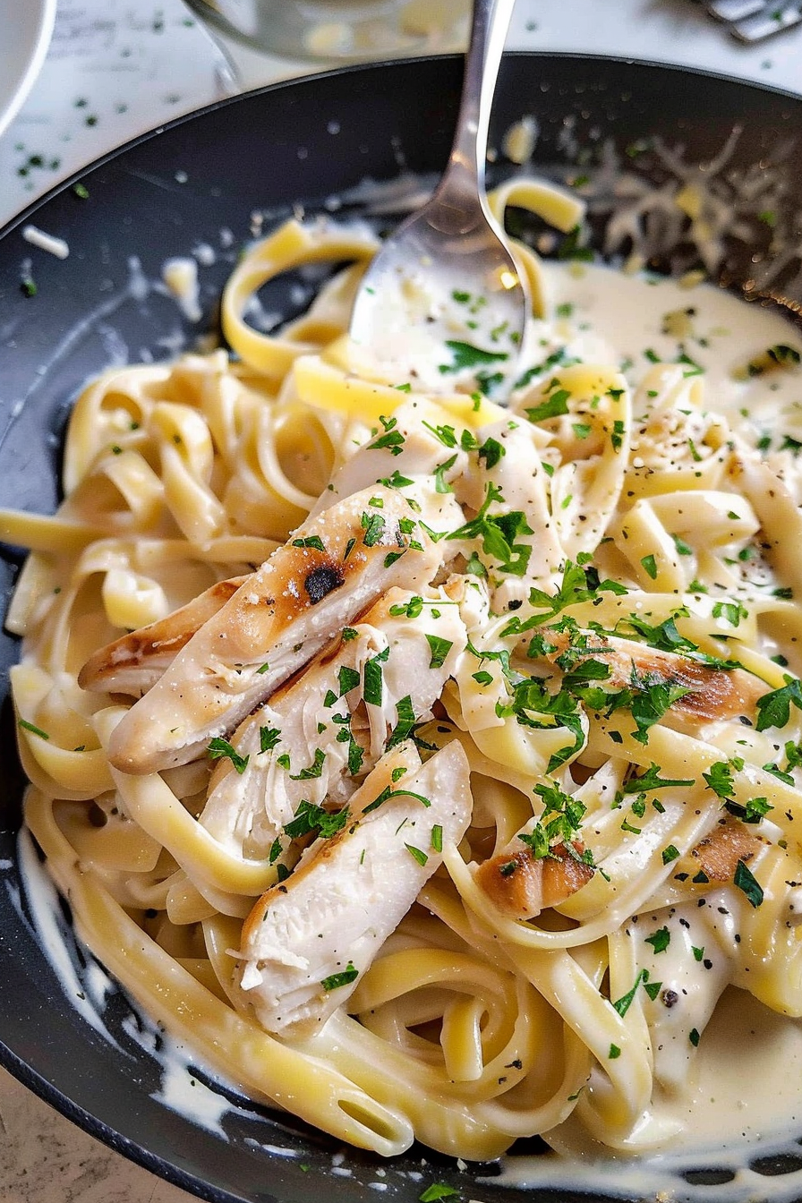 A creamy Italian-American classic combining tender chicken, silky fettuccine, and a rich Parmesan cream sauce for an indulgent weeknight meal.