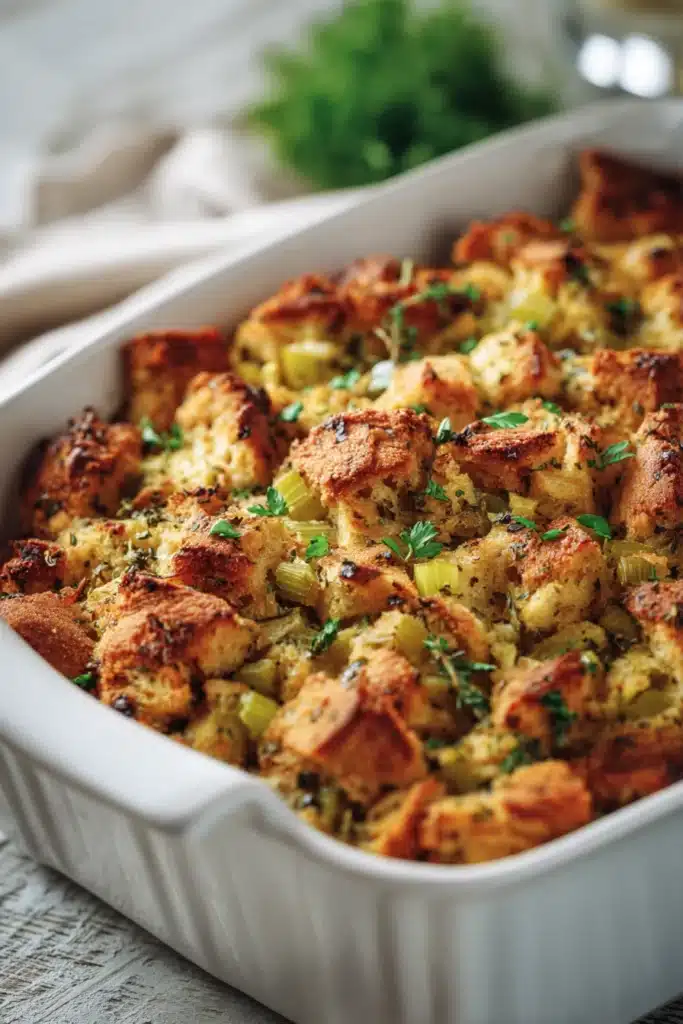 The stuffing bakes to golden perfection — crisp on top and soft underneath. It’s versatile enough to bake inside the turkey or in a separate dish, depending on your preference. The recipe also scales easily: halve it for stuffing for 2 people, or double it for a crowd. Whether you’re making it ahead or enjoying it fresh out of the oven, this recipe promises to be the star of your table.