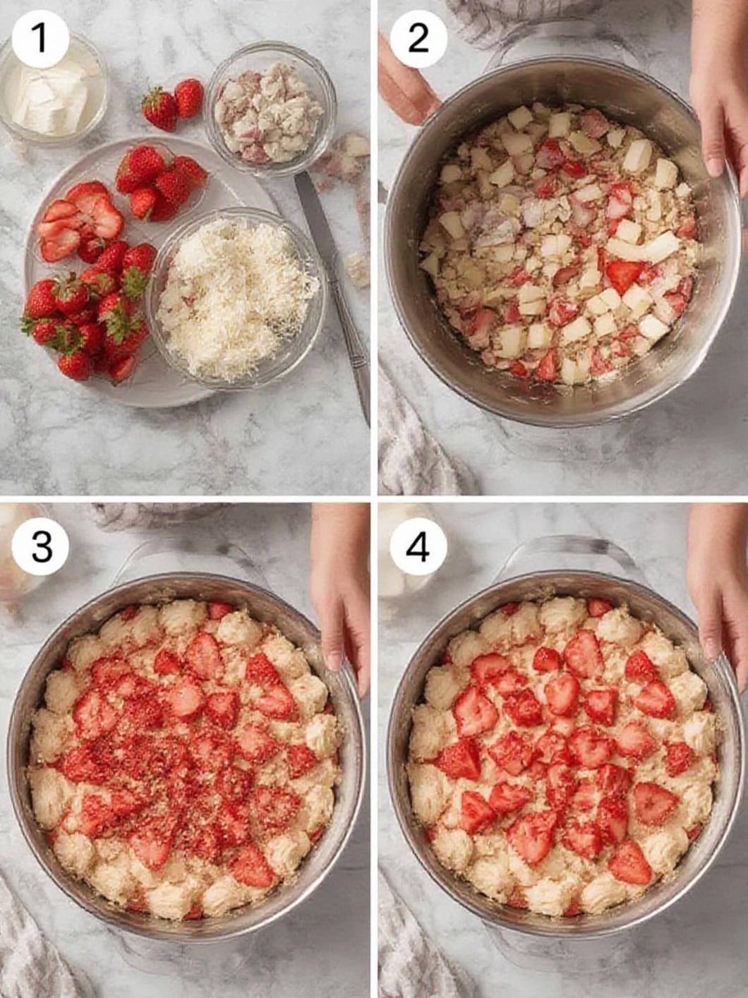 - Macerate strawberries: Toss sliced strawberries with granulated sugar and let sit 15 minutes to release juices.