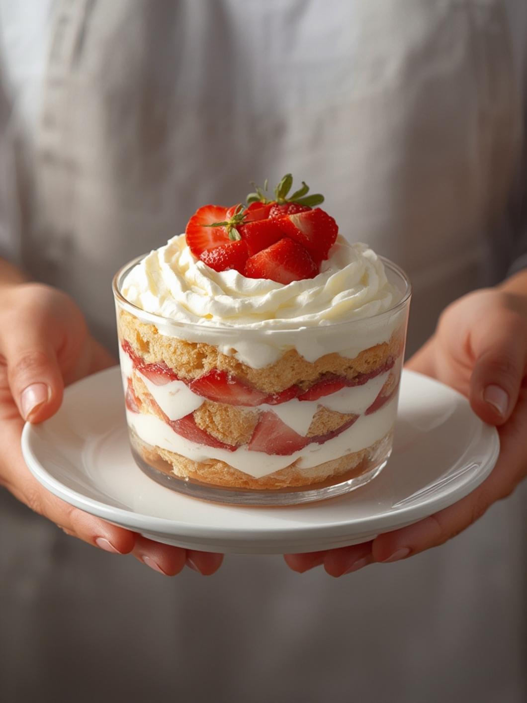 - Layer trifle: In your dish, alternate cake cubes, strawberries (with juice), and whipped cream. Repeat 2–3 times.
